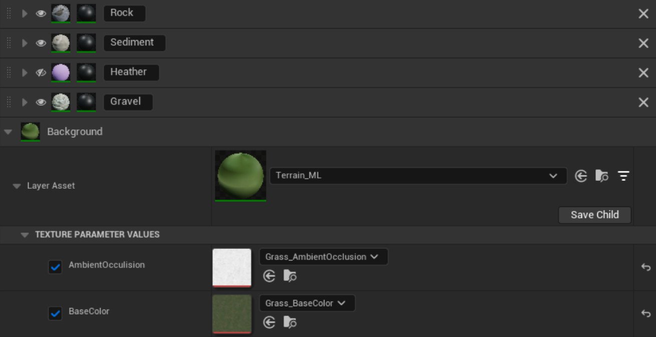 I created a landscape material in Unreal that piped the weight maps through unused material attributes. Weight maps are greyscale images that determine how much of each material layer is visible on the landscape. This allows a landscape to have multiple materials applied to it. Inside each of the material layer blends the weight map was extracted from the material attribute.